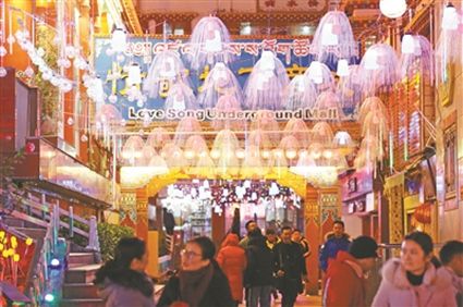 火樹銀花不夜天,流光溢彩呈繽紛?!敖衲甑囊咕罢嫫涟。 蓖钒⒁毯偷窃鍪迨逋盹埡髱е鴮O女來到將軍橋散步,在自己的家鄉(xiāng)欣賞到如此美妙的景色,登增叔叔忍不住夸贊。此時,將軍橋道路兩旁的綠化帶在彩燈的映襯下輪廓畢現(xiàn),與玻璃棧道上的光影交相輝映,城市美景盡在其中。