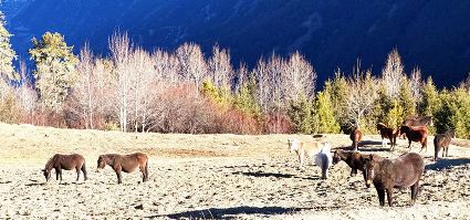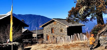 洛克所經(jīng)過(guò)的地方就是三巖龍鄉(xiāng)的猛董,這是一處鮮為人知的隱世天堂。猛董有“五絕”,即“山、湖、谷、寨、寺”,山是被當(dāng)?shù)厝诵欧顬樯裆降柠湹刎暩拢湹?,藏語(yǔ)為珍珠),湖是神山腳下的麥地措(珍珠湖),谷是雅礱江谷地的藍(lán)月山谷,寨是猛董“后花園”的普米寨子,寺是修建于明清時(shí)期的猛董古寺。