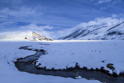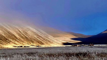季春初始,濃霧夾帶著高原的寒風(fēng),彌漫在這片純凈素簡的大地上。朦朧中,紛紛揚(yáng)揚(yáng)的春雪,落在山峰,落在河谷,落在屋檐,落在林間,頃刻間就給萬物披上了銀白色的春裝。山麓、河谷、村落被白色潤染,像是喚醒一簾純白的甜蜜美夢;枯樹、春花、牧草被水汽滋潤,像是撫慰一冬的孤獨(dú)清寂。