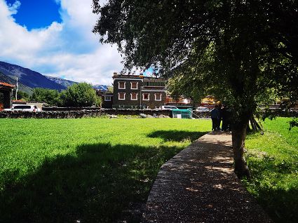 夏日,暖陽溫柔,沿途入眼皆是綠意。聽說,俄色花盛放的時(shí)候,潔白的花成簇成團(tuán),一樹樹漫山遍野,像九天的云朵堆滿山谷田野,汽車從公路疾馳,風(fēng)里都是俄色的清香。我們來的時(shí)候稍微遲了,錯(cuò)過了俄色的花期,花開荼蘼,殘花在蒼翠的枝葉里躲藏,風(fēng)里是飛舞的花瓣,紛紛揚(yáng)揚(yáng),在棕紅的棧道鋪成白色的云錦,樹下是芬芳的余味。棧道邊,金黃的雪白的野花鋪灑在翠綠的草甸上,像濃烈的水彩。地里的青稞,綠得晃人眼睛,綿延的是木雅人勤勞與希望。遠(yuǎn)處,木雅民居在各種深綠淺綠的陪襯下更加的濃墨重彩。