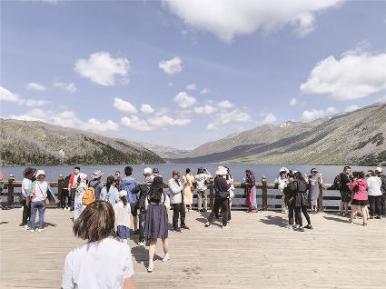 晨曦微露,湖面如鏡子般平靜透亮,倒映著藍(lán)天、白云、高山和白雪;傍晚時(shí)分,夕陽西下,波光粼粼的湖水如金子般閃耀。