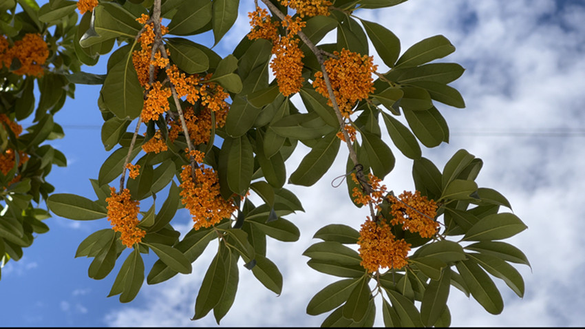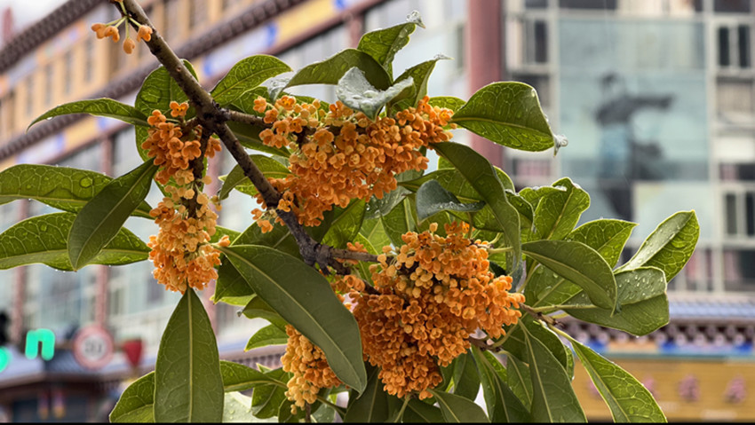 無間纏綿的秋雨后,漫步在巴塘的街道,悠悠的一股香氣沁入心扉。此時(shí),頭頂?shù)乃{(lán)天,云卷云舒,嬌小的丹桂掛在樹梢枝頭輕輕搖曳,花香詩(shī)意相融于高原江南別有意趣。