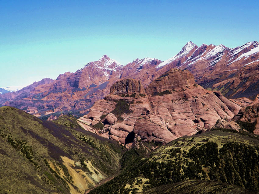 到了新龍縣,從新龍縣銀多鄉(xiāng)向北遠(yuǎn)望,你就會(huì)看到迄今為止青藏高原上發(fā)現(xiàn)的海拔最高、區(qū)域最廣的丹霞地貌。綿延三十多公里的紅色,在烈日照耀下閃耀著刺目的光,與周圍墨綠色的山體形成鮮明的對(duì)比。