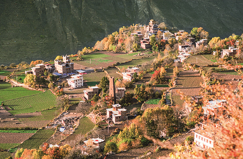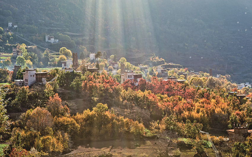 四季更迭,中路藏寨的魅力各異。秋天,正是藏寨最為絢爛的季節(jié)。造型獨(dú)特、別致的藏式民居,蜿蜒曲折的林間小道,組成了一幅美不勝收的畫卷。藏寨依山勢迤邐連綿,分布在相對高差近千米的山坡上,藏式樓房灑落在五彩斑斕的彩林中,與山谷、溪流、雪峰交相輝映,極富層次,構(gòu)成了一幅恬靜如詩的優(yōu)美畫卷。