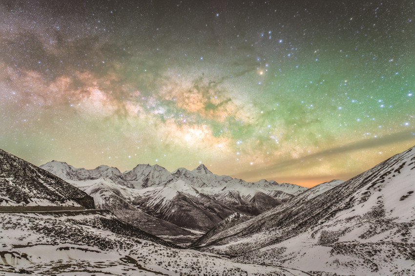 我州地廣人稀、海拔較高,光污染較少,離康定城區(qū)不遠的折多山頂、子梅埡口、雅哈埡口等地,云層稀薄,空氣干燥,視野開闊,晴朗天氣下,每當夜幕降臨,銀河肉眼清晰可見,如煙似紗,置身其中,如夢似幻。星河像一道氣勢磅礴的瀑布、一幅色彩斑斕的油畫、一束絢麗多彩的禮花,令人贊嘆,驚艷眼球,壯美異常。