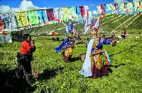 格薩爾王在藏族的傳說(shuō)里是神子推巴噶瓦的化身,一生戎馬,揚(yáng)善抑惡,宏揚(yáng)佛法,傳播文化,成為藏族人民引以為自豪的曠世英雄。這是筆者在格薩爾誕生地——德格阿須草原現(xiàn)場(chǎng)拍攝的一組照片,它呈現(xiàn)了康巴藏區(qū)送文化下鄉(xiāng),牧民如過(guò)節(jié)一樣歡樂(lè)的盛況。該組圖片為演出現(xiàn)場(chǎng)。