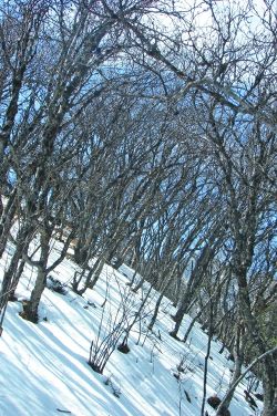 在馬鞍山頂?shù)谋泵婕氨逼拢幸黄坏竭呺H的樹林。冬天的這片樹林,呈成熟而貴氣的暗褐色,葉落枝出,紛亂、素凈、蕭瑟、清貴。于是,以雪地和樹林作背景,也照了不少相。