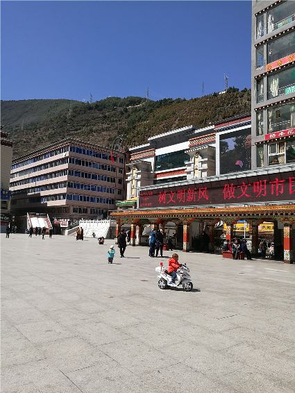 天空像剛被浸染的綢緞,蔚藍(lán)的主色已經(jīng)略顯;白雪好似從浸染的綢緞上滴落下的顏料與其它顏色的混合,眷戀的駐足在山尖,在其耳旁傾訴來(lái)年的約定;一顆顆萬(wàn)年青穩(wěn)穩(wěn)的站立,將山中的寺廟、亭閣緊緊地包圍,見(jiàn)證著康定四季輪回的變化;依然披著秋冬贈(zèng)予黃色外衣的樹(shù)木,拋開(kāi)桎梏,堅(jiān)守在一座座樓房旁。藍(lán)與白,黃與綠……這大美的晴天為人們帶來(lái)了別樣的視覺(jué)盛宴。
