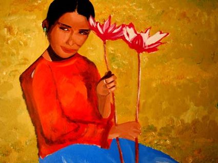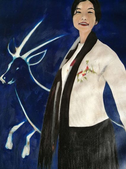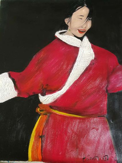 畫畫三年多了。十三歲寫詩;到了高原后,方開始創(chuàng)作長篇小說。在上海,我做過畫廊。但要說斗膽動(dòng)筆畫幅肖像。我是在白度母唐卡前燃了三炷香的。包括在咖啡店現(xiàn)場作畫。到京城繼而國外辦畫展,我認(rèn)為都是因了我把畫布當(dāng)成了詩稿的緣故。于是,大家喜歡我這種野路子,天馬行空,可又不舍方圓的創(chuàng)作手法。接下來,歐洲、東京還會(huì)有我的系列展覽。