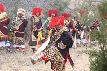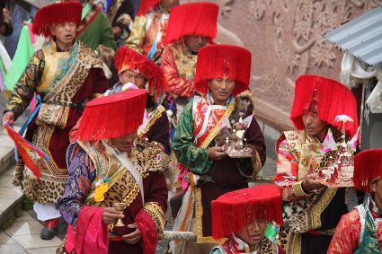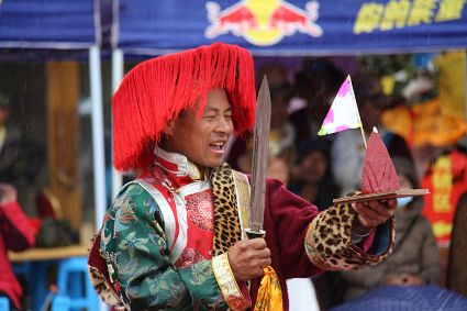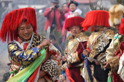 除了歌舞文化,德欽還是民俗文化最大的平臺,神山祭祀是村村寨寨必不可少的活動,在德欽,藏民對山水自然賦予了靈性,認為自然也是和人一樣有著生命和靈性,尊重自然演繹出神山祭祀活動豐富多彩?!暗顿潯?藏語稱“百諧”。在德欽農村,刀贊是祭祀活動的重頭戲,這一天,不亞于一個盛大的服飾表演。相傳“百諧”是古時村民為消除戰(zhàn)亂,祈福平安的一項傳統(tǒng)祭祀活動,延續(xù)至今已經成為一項傳統(tǒng)的民俗活動?!鞍僦C”既是祭祀活動的一個儀式,也是一個獨立的傳統(tǒng)民俗活動,村里每戶一男丁在這一天必須參加“百諧”。“蘇夏”是村里男人戴的最為隆重的帽子,他不同于金邊帽和狐皮帽。長刀是“刀贊”的道具, “吉祥的日子里,我們一敬天地,賜給我們帶來幸福的生活;再敬尊敬的共產黨,為我們帶來平安吉祥;三敬慈祥的雙親,教會我們如何做一個好人……”朗朗上口的說詞伴著閃閃的刀光起舞,頗具康巴壯士的英武陽剛。