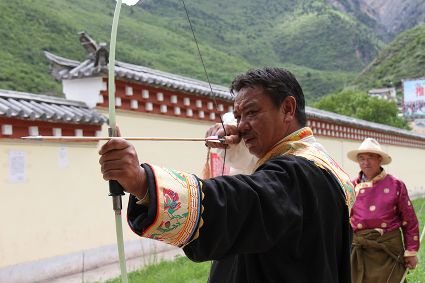 射箭也是德欽以及周邊些村落的重要民俗活動之一,村里的男人們盛裝出場,在射箭場彎弓搭箭,從7、8歲小孩到50多歲的老人都要參加射箭,甭管你射得中靶子與否,笑聲里充滿了和諧和喜慶。德欽縣的江坡村,在每年桃花盛開的季節(jié),都要開展盛大的射箭節(jié),全縣的射箭愛好者都前來一顯身手,康巴漢子們不僅射得一手好箭,還得會拉弦子,悠揚的弦子聲可以給射手們加不少分,活動的初衷就是要求藏族男人必須能文能武。弦子聲聲,唱出了藏家百姓美好的生活,村里的女人戴上了各種金銀首飾,男人們手拉弦子,盡情歡暢的唱著、跳著,村里的老人們是忠實的觀眾,看著大家在舞場里的步子,他們也跟著笑得合不攏嘴,有些年輕人還不時跑出舞場到場邊的老人們面前請教弦子的唱詞,老人們總是不厭其煩的傾囊相授,因為他們曾經也是弦子舞場的“明星”。