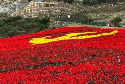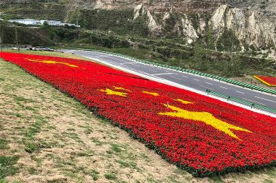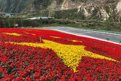 7月1日是中國共產(chǎn)黨98周歲的生日。四川甘孜藏族自治州瀘定縣用23萬多株鮮花,在雅康高速路瀘定連接線出口處擺了鮮紅的黨旗、國旗造型,以此表達對黨的感情。