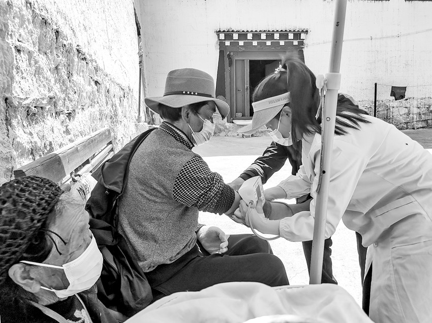圖為入戶開展腫瘤防治宣傳時醫(yī)護人員提供免費量血壓服務(wù)。