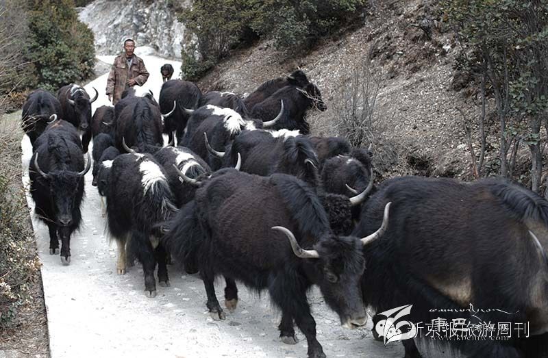 景區(qū)路上常有牧民趕著牦牛經(jīng)過。這里居住著很多藏族居民。![]()