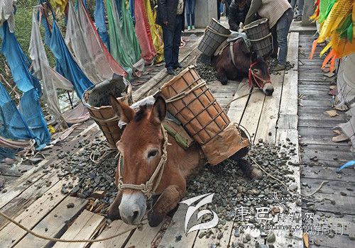 這是318和317國道都不通過的甘孜州白玉縣,從白玉縣城通往建設(shè)鄉(xiāng)德沙村的路是一條木制棧橋,2014年5月4日的中午,兩頭騾子在300斤石料的重壓下踩斷了中間的橋板,兩條前腿從踩碎的木板處懸著,騾子發(fā)出粗壯的喘息聲,無法掙扎,不能動彈。棧橋上有路過的藏民,手中旋轉(zhuǎn)著轉(zhuǎn)經(jīng)筒,他口中念念有詞:騾子啊,你還沒有得到解脫。一群來自外地的游客都很驚詫。 騾子運(yùn)輸隊的王玉海,在過往行人和同行的騾隊鄉(xiāng)親的幫助下,先卸下騾子身上背負(fù)的碎石,然后手伸到騾子前腿根處,用力抬起騾子的前身。在查看騾子沒有受傷后,王玉海把這兩只騾子牽到騾隊最后面,然后,引著另外5只負(fù)重的騾子,從橋靠左邊的雙層木板橋面上通過,騾子隊受到驚嚇,不愿意上橋,王玉海安撫了一會兒騾子隊后,在同伴的協(xié)作下,前面牽引,后面驅(qū)趕,終于,王玉海的7只騾子過橋,其他8個同伴的50多頭負(fù)重的騾子也一一通過。