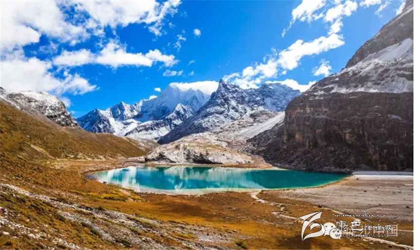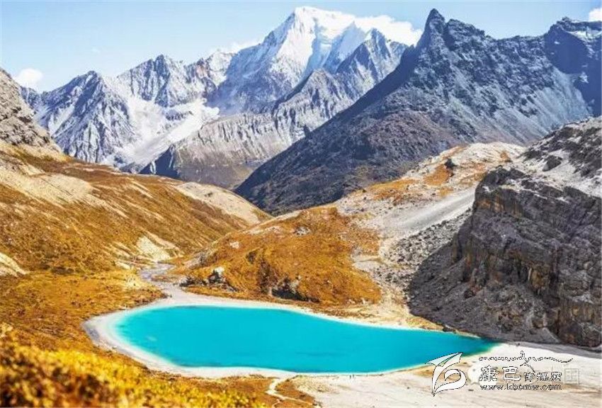 三神山中間的牛奶海,美麗的高原堰塞湖,面積0.5公頃,海拔4500米,四周雪山環(huán)繞,湖水清瑩碧藍,山上成瀑,以其玲瓏秀雅水色翠藍而著名,牛奶海上方有大片的冰川。傳說每年春暖花開之時,湖水會像牛奶一樣潔白如瓊漿,并因此得名牛奶海。