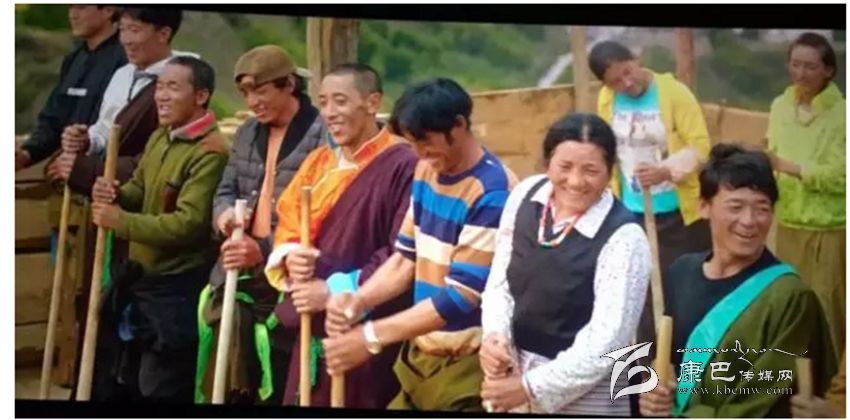一群腰圍圍裙的藏族人,手執(zhí)木夯(hang),分成兩組,在勞動時此起彼伏的唱著夯屋頂時的勞動歌。歌聲統(tǒng)一著步調(diào),木棒夯土的聲音是節(jié)奏,一輪又一輪的合唱。這就是“打阿嘎”。