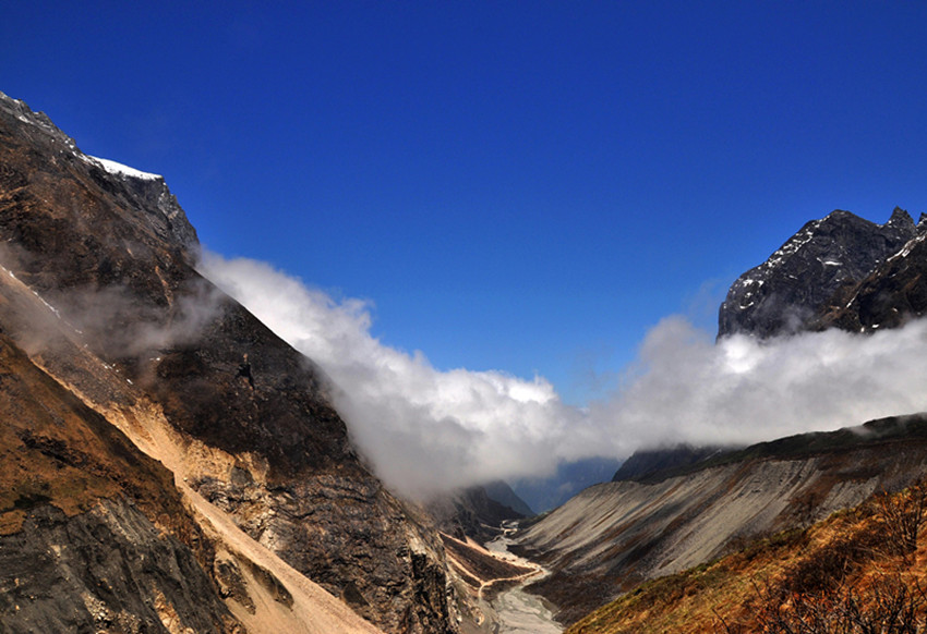 第二天,我們準(zhǔn)備游玩燕子溝,醒來(lái)的第一件事就是拉開(kāi)窗簾看看天氣,又一陣興奮,天氣依然非常晴朗,今天是進(jìn)燕子溝的第一天,我早做足了準(zhǔn)備,太陽(yáng)帽、墨鏡、食品等等一樣不少。從磨西到燕子溝溝口的路程很長(zhǎng),需要坐景區(qū)的觀光車,因?yàn)樘鞖獾脑?,山上只有少些云霧繚繞,環(huán)在山腰,仿佛是一幅山水畫(huà)景。我們先來(lái)到了冰窖口,這里的海拔有三千多米,所幸大家都沒(méi)有高原反應(yīng),后坐車下山,來(lái)到有“定海神針”之稱的一棵高大筆直的杉樹(shù)。這棵杉樹(shù)皮粗厚,已經(jīng)沒(méi)有了樹(shù)葉,樹(shù)枝也寥寥無(wú)幾,更顯滄桑。站在樹(shù)下遙望,顯得人是那么渺小。不禁讓人遐想這顆千年古樹(shù)的滄桑歷史。然后開(kāi)始步行游玩,這里海拔比較低,走 起來(lái)不是很累,在城市中見(jiàn)慣了高樓大廈,車水馬龍的我們,此刻真有一種離開(kāi)凡塵,來(lái)到世外桃源的感覺(jué),我們一路依山而上,越走越高。我們終于來(lái)到了天藥水坪,這里的景色已經(jīng)完全不同于山下,看著遠(yuǎn)處的山,我們都不約而同地“哇”了一聲。