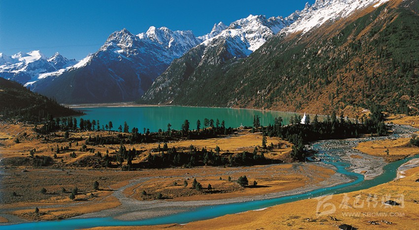 玉隆拉措又名新路海,海拔4040米,傍川藏公路。新路海為冰川湖泊,平均水深10米,面積6.2平方公里。湖泊三面依山,一面臨塬,凝靜時“秋水共長天一色”,象一碩大的明鏡映奇瑰山色于水中,又如靚藍的畫布上碧峰入幀;時有輕風蕩來,湖中波光瀲滟,若仙女弄影。夏季湖水清澈見底,冬春時則靜謐得滲出翠綠來。正面處是一座雪影婆娑的奇峰,巋然不動;與雀兒山相呼應(yīng),兩峰之間冰清玉潔,整個溝壑處冰瀑縱橫錯落,呈跳躍狀直撲谷底而來。