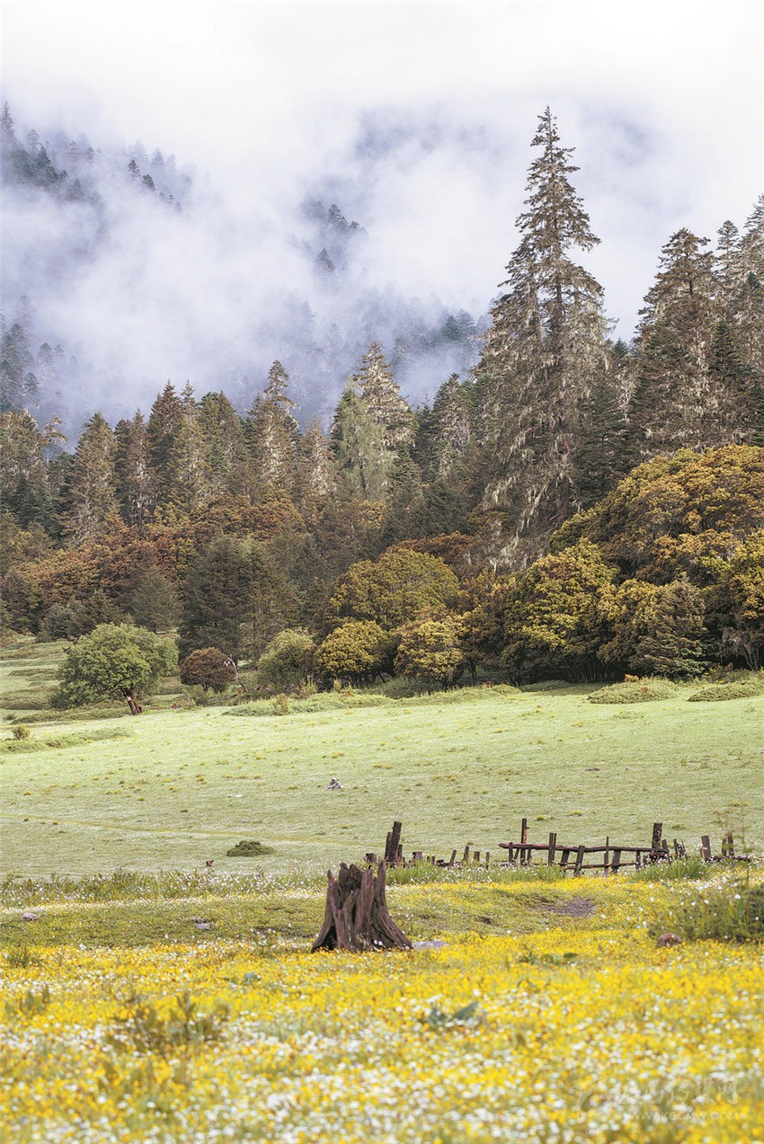 置身于雪山、湖色與草色,陽光精確地照在一棵金色的樹上,樹的光亮奪目與遠處云霧繚繞的暗山形成反差,如夢如醉。