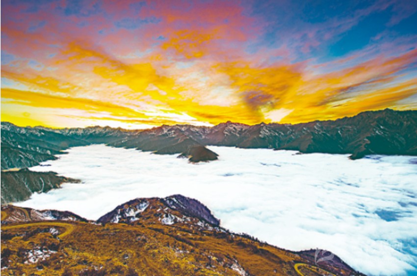 一條群山環(huán)繞的河谷,從衛(wèi)星圖上看,它就像一片樹葉,水系是莖脈,森林是葉的紋理,群山是齒狀起伏的葉緣。灣壩地區(qū)三面皆被海拔在4500米以上的高大山體環(huán)峙,僅南側(cè)有窄如細(xì)縫的峽谷通往外域,自然地理環(huán)境相對封閉原始,山谷風(fēng)作用就此產(chǎn)生。即當(dāng)太陽出來后,山坡比谷底更早被加熱,山坡空氣受熱膨脹,密度變小,利于中午前后谷底的氣流補(bǔ)償進(jìn)來,形成向上抬升,增加了上升動(dòng)力;加上云層的高度小于山頂?shù)母叨龋托纬闪撕陚验煹脑坪>坝^。灣壩云海是整個(gè)甘孜州規(guī)模最大的云海之一,也是最容易見到的云海,其云海規(guī)模達(dá)上萬畝,基本全年都可見,一年中最佳觀賞時(shí)間是春夏之際。