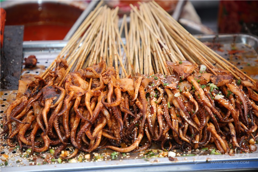 作為一個(gè)四川人,對(duì)于麻辣味的食物毫無(wú)抵抗力,在康定后街林立的商鋪中,記者一眼就相中了“深海魷魚(yú)花”這家店??粗褐t油的魷魚(yú)花靜靜地躺在紅椒和芹菜間,記者咽了咽口水,向老板買(mǎi)了一份兒?!罢媸羌兗兊拇ㄎ秲簺](méi)錯(cuò)了,又麻又辣的。”記者對(duì)老板說(shuō)。老板回答到:“魷魚(yú)花最講究的就是刀法了,要切得好看。雖然在顧客看來(lái)都差不多樣子,但是我每次都要經(jīng)過(guò)細(xì)細(xì)斟酌再一刀一刀的切,爭(zhēng)取多弄幾種樣式,現(xiàn)在我的??蛡円矔?huì)細(xì)細(xì)地考究我切的魷魚(yú)花了。以前我只賣(mài)烤魷魚(yú),只是在家里偶爾會(huì)給我兒子做魷魚(yú)花,后來(lái)看我兒子喜歡吃,才開(kāi)始慢慢地賣(mài)魷魚(yú)花,沒(méi)想到還是很受歡迎。這次美食節(jié),我發(fā)現(xiàn)沒(méi)有人做魷魚(yú)花,所以我就帶著我兒子喜歡的魷魚(yú)花來(lái)參加這次美食節(jié)了?!崩习逍χ浾哒f(shuō)。
