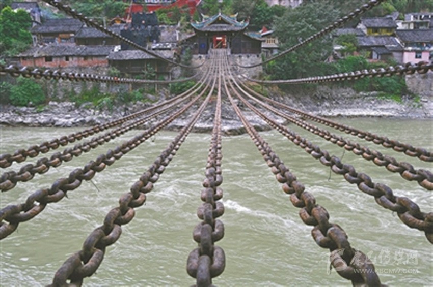 “瀘定橋”有人又稱“鐵索橋”。相傳康熙帝統(tǒng)一中國(guó)后,為了加強(qiáng)川藏地區(qū)的文化經(jīng)濟(jì)交流而御批修建此橋,并在橋頭立御牌。1935年,中國(guó)工農(nóng)紅軍在長(zhǎng)征途中“飛奪瀘定橋”,使之成為中國(guó)共產(chǎn)黨重要的歷史紀(jì)念地。1961年,瀘定橋被中華人民共和國(guó)國(guó)務(wù)院公布為第一批全國(guó)重點(diǎn)文物保護(hù)單位之一。瀘定橋全長(zhǎng)103.67米,寬3米,由橋身、橋臺(tái)、橋亭三部分組成:橋身由13根碗口粗的鐵鏈組成,左右兩邊各2根,是橋欄,底下并排9根,鋪上木板,就是橋面。每根鐵鏈由862至997個(gè)由熟鐵手工打造的鐵環(huán)相扣,總重量達(dá)21噸。