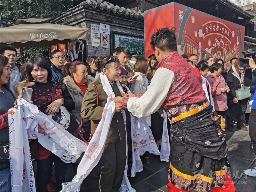 快閃還未開始,20名身著少數(shù)民族服裝的藏族姑娘小伙,便成為了一道最獨(dú)特、亮麗的風(fēng)景線。隨后,他們給游客們帶來了獨(dú)具甘孜特色的歌舞《康定情歌》《甘孜踢踏》,悠揚(yáng)的歌聲、奔放的舞步,讓圣潔甘孜大美天成的獨(dú)特風(fēng)韻完美展顯,吸引了春熙路如潮的人群,被歌舞魅力感染,不少市民隨著他們一起唱跳了起來。而此時(shí)的成都寬窄巷子里,也正在演繹著一場(chǎng)震撼的“快閃”,四名穿著格薩爾王服飾的大將,身披鎧甲、手持刀劍,格外威武帥氣,市民和游客紛紛拿出手機(jī)拍照留念?!翱扉W”結(jié)束后,熱情的甘孜兒女為周邊的觀眾獻(xiàn)上潔白的哈達(dá),向他們致以美好的祝福,并誠(chéng)摯歡迎他們到甘孜旅游。