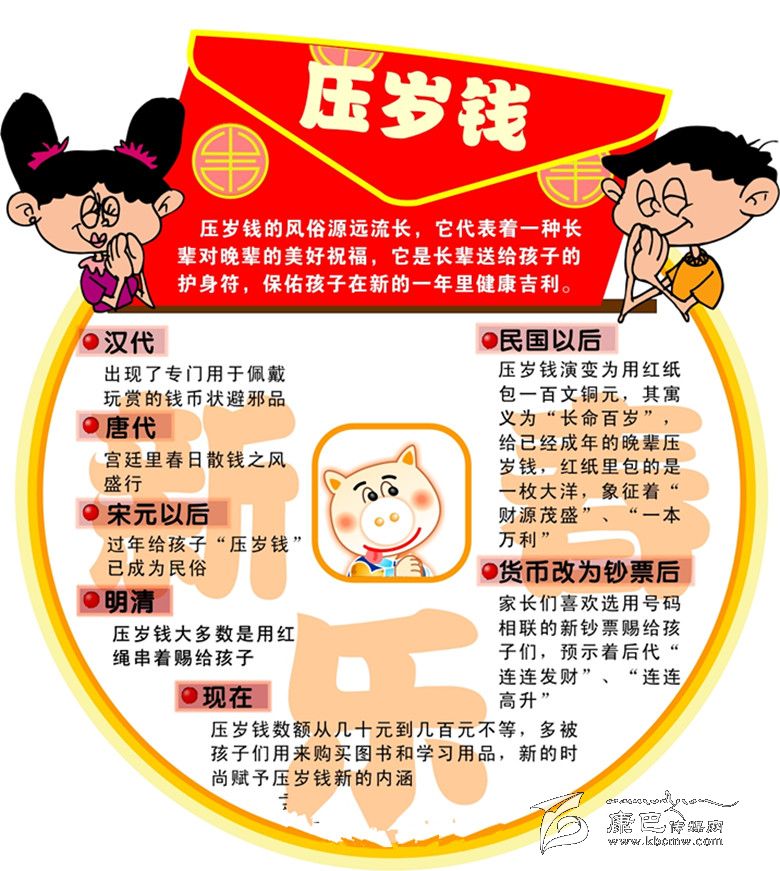 民間的習(xí)慣都是守歲守到半夜,即從除夕那天的亥時(shí)至元旦那天的子時(shí)之間開(kāi)始入席,稱(chēng)之為“分歲酒”。一家人歡歡喜喜地喝完分歲酒之后,長(zhǎng)輩還要給小孩子們分“壓歲錢(qián)”。舊時(shí)的風(fēng)俗,壓歲錢(qián)規(guī)定一百枚,用紅繩串好,取百年長(zhǎng)壽的意思。當(dāng)然,目前改為給給鈔票,數(shù)