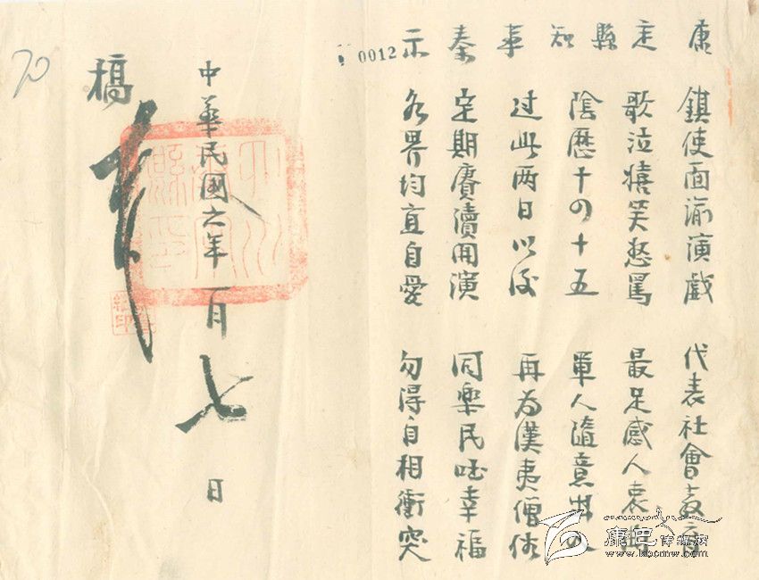 除此之外,康定縣知事又煞費(fèi)苦心地再寫了一篇“順口溜”式的告示,告示上寫道:鎮(zhèn)使面喻演戲,代表社會教育。歌泣嬉笑怒罵,最足感人衷曲。陰歷十四十五,軍人隨意出入。過此兩日以后,再為漢藏僧俗。定期庚續(xù)開演,同樂民國幸福。各界均宜自愛,不得自相沖突。