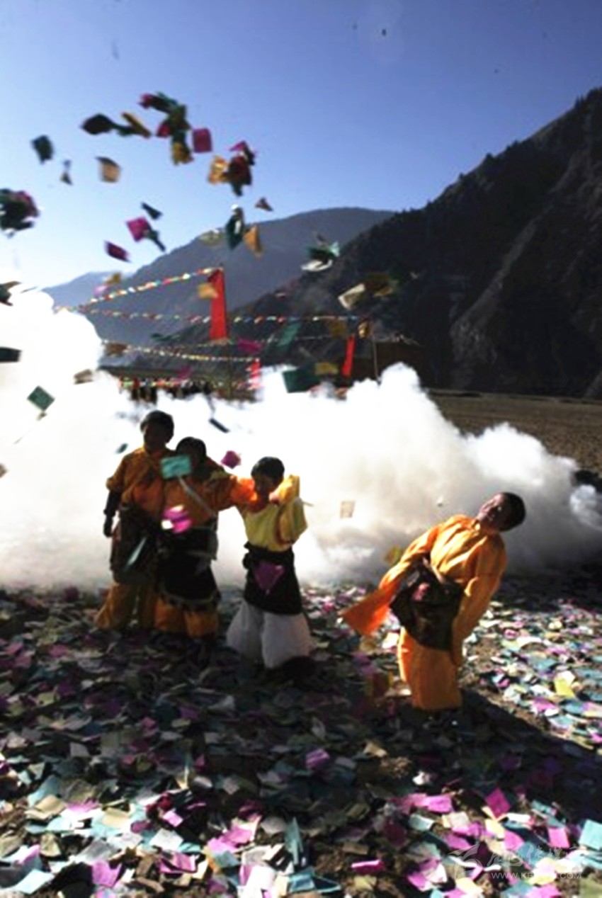 正午時分,村里的小伙子身著節(jié)日盛裝,手持木刀、木劍,肩扛松星到神山去祭山神,將木刀、木劍和松星插在神塔上,他們認(rèn)為這樣做就可以全副武裝山神了,任何妖魔鬼怪都不敢來侵?jǐn)_村莊了。小伙子們在神塔旁邊點燃柏枝,撒上青稞酒、糌粑、酥油、茶葉、大米等,然后圍著白塔轉(zhuǎn)經(jīng),呼喚著各種動物的名字,喇嘛在一旁齊聲祈福。新龍人特別注重過十三節(jié),所有讓人興奮的娛樂活動都會在十三這天下午在村子里隆重上演,村民不僅是各種娛樂活動的參與者,更是最忠實的觀看者。