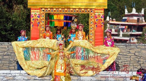 在催人奮進(jìn)的戰(zhàn)鼓聲中,一群身披甲胄的士兵拿著長劍,背著巨弓走到臺前,在鏗鏘的戰(zhàn)鼓聲中,戰(zhàn)士們做著各種競技動作,模仿武士們互相攻擊的樣子,那矯健的身影展示了遠(yuǎn)古時(shí)代嘉絨藏族先民們?yōu)榱松媾c自然努力抗?fàn)幍膱鼍啊_^了一會兒音樂一轉(zhuǎn),戰(zhàn)鼓聲漸漸減弱,在鳥雀的陣陣啾啾聲中,一座木門慢慢的開啟,一位身披長袍、頭戴鳳冠的女王在眾多美女的簇?fù)硐?,緩緩走下臺階步入舞臺中央,此時(shí),一位手捧托盤的老者來到女王面前單膝下跪,將托盤高舉過頂,并邀請女王品嘗佳肴,女王將中指在酒中蘸了蘸,并曲起中指向四周輕輕彈去,寓意愿將杯中美酒與四方百姓同飲。在女王面前還放置著一個凈水桶,桶中盛滿了清澈的甘泉,桶上橫放著一枝柏樹枝,女王伸出纖纖玉手,拿著柏樹枝在水中蘸了蘸,面向墨爾多神山撒去,寓意向神山祈福。這是此次《美人谷·丹巴》節(jié)目展演中的序曲部分,有著強(qiáng)烈的東女神韻,將遠(yuǎn)古時(shí)代東女國女王遺風(fēng)展演的淋漓盡致。
