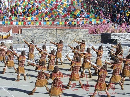 10月26日,在甲居藏寨,處處洋溢著豐收和歡樂的氣氛,人們扶老攜幼,身著節(jié)日的盛裝走到一起,來共同慶祝丹巴嘉絨風(fēng)情節(jié)的順利召開。在一塊空地中,搭建了臨時(shí)的舞臺,看臺上,幾座古碉模型傲然挺立,在不遠(yuǎn)處,一座古碉矗立在一座小山包上,與古碉模型遙相呼應(yīng)、相映成趣。上午9時(shí)40分,當(dāng)節(jié)目主持人宣布嘉絨風(fēng)情節(jié)正式開始時(shí),一束束搖曳的煙花向空中飛去,在空中炸響后,散發(fā)出五顏六色的煙霧,其中有的還幻化成幾多小小的降落傘,就像多多盛開的鮮花在空中綻放。演出現(xiàn)場前的大地和遠(yuǎn)處的小山坡上到處都站滿了熱情的觀眾,合著禮花的爆裂時(shí)的響聲,將手中的小紅旗展開,高舉過頭頂,有節(jié)奏的左右搖動,霎時(shí)間,整個現(xiàn)場成為了紅色的海洋。