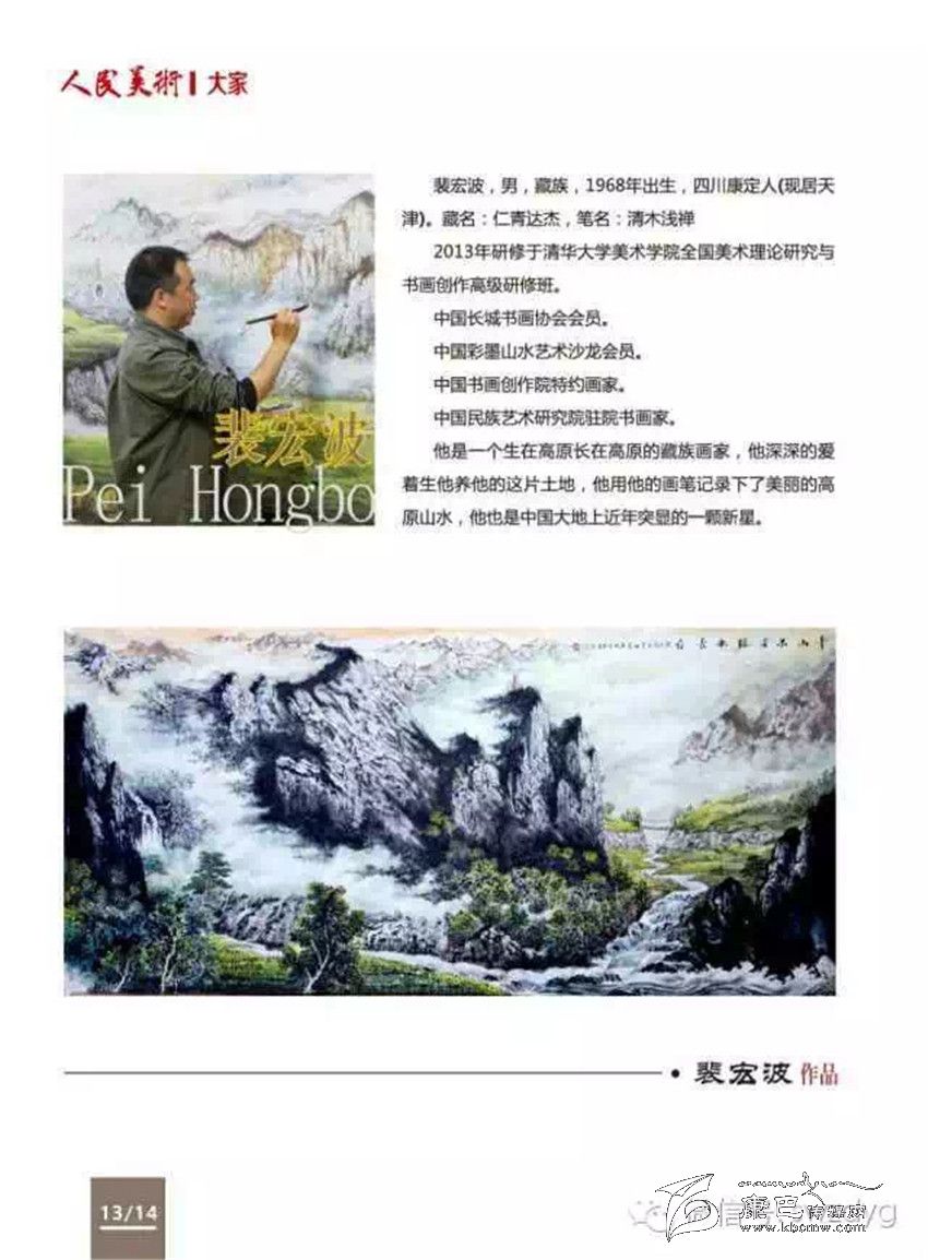 《人民美術(shù)》是中國最具權(quán)威的美術(shù)雜志、國家核心美術(shù)雜志和美術(shù)界最高學(xué)術(shù)雜志,由《人民日?qǐng)?bào)》社主管。雜志社對(duì)裴宏波及其作品給予了高度評(píng)價(jià),認(rèn)為藏族畫家裴宏波的作品極具生命力,在中國美術(shù)史上又有了新的突破,富有民族性、地域性、創(chuàng)造性、歷史性,最終決定列選為中國大家。雜志中裴宏波排在劉大為、曹雕、劉文西等之后。
