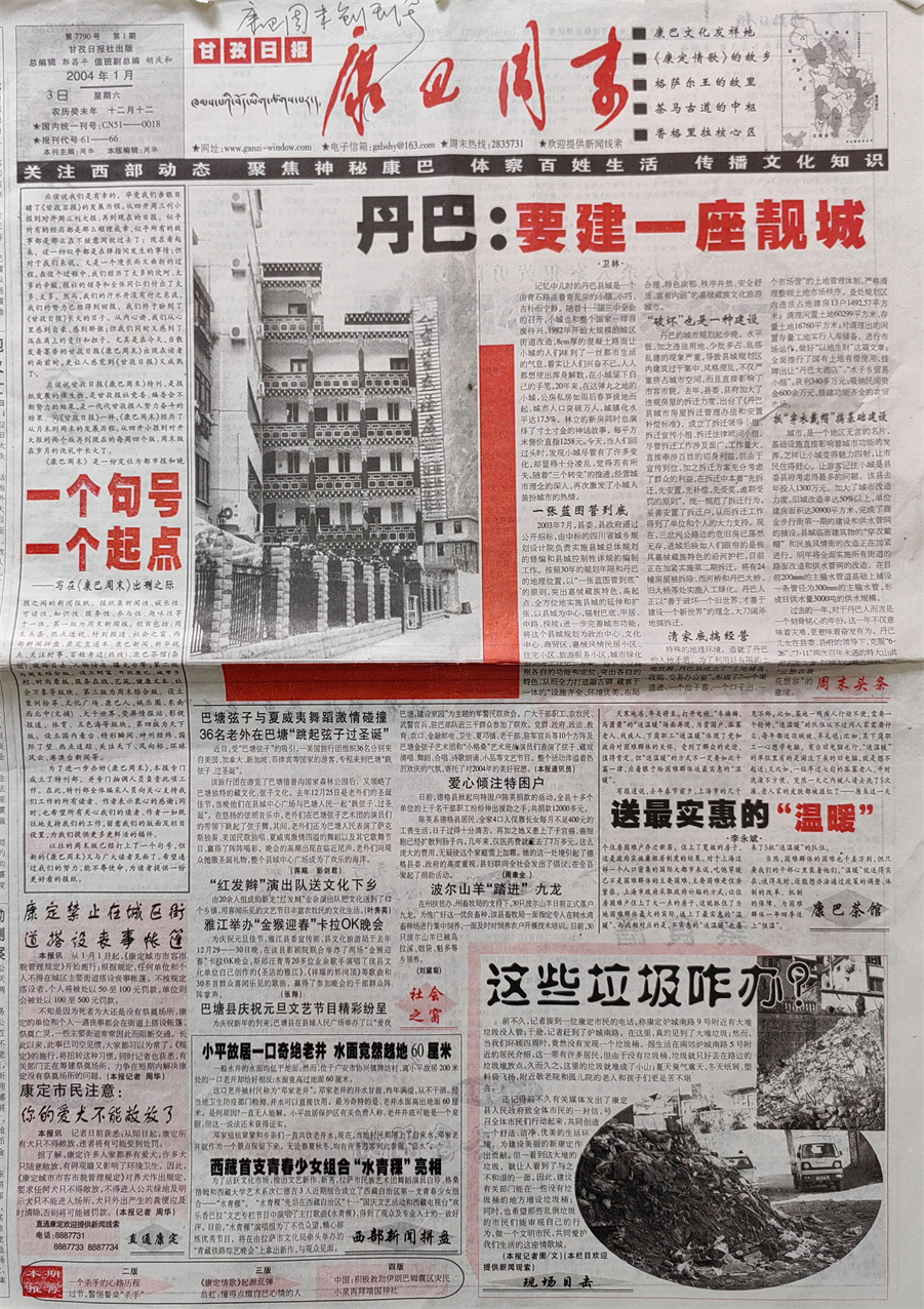 經(jīng)過(guò)緊鑼密鼓的籌措后,2004年1月3日,也就是在《甘孜報(bào)》正式改為《甘孜日?qǐng)?bào)》的第三天,第一期《康巴周末》與讀者見(jiàn)面了。《康巴周末》創(chuàng)刊號(hào)的報(bào)頭是時(shí)任《甘孜日?qǐng)?bào)》社副總編輯胡慶和先生書寫的,同時(shí)還配發(fā)了我撰寫的題為《一個(gè)句號(hào)、一個(gè)起點(diǎn)》的發(fā)刊詞。創(chuàng)刊號(hào)第一版推出的是周末新聞版,當(dāng)期與讀者見(jiàn)面的欄目包括:周末頭條、社會(huì)之窗、直通康定、現(xiàn)場(chǎng)目擊、康巴茶館、西部新聞拼盤等;第二版為周末綜合版,推出的是案例拾萃、健康文本欄目;第三版為周末綜合版,推出的是文化廣場(chǎng)欄目;第四版為天下版,推出的是國(guó)內(nèi)外奇聞逸事。此外,《康巴周末》創(chuàng)刊伊始,還推出了有獎(jiǎng)?wù)骷侣劸€索活動(dòng),凡是提供有一定新聞價(jià)值的社會(huì)新聞,經(jīng)采訪核實(shí)后,都會(huì)給予線索提供者一定獎(jiǎng)勵(lì)。這種線索征集活動(dòng),不但擴(kuò)大了新聞源,還在一程度上為《康巴周末》迅速贏得讀者的青睞起到了推波助瀾的作用。直到后來(lái)在舉辦《康巴周末》創(chuàng)刊一百期活動(dòng)時(shí),讀者還對(duì)此給予了充分肯定。