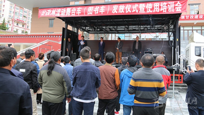 本網(wǎng)訊(記者 宋志勇 文/圖)6月22日,我州流動舞臺車(圖書車)發(fā)放儀式暨使用培訓會在康定舉行,旨在為全州13個縣(市)及州歌舞團、州圖書館統(tǒng)一配發(fā)流動舞臺車、圖書車,著力解決基層群眾看文藝演出難、看圖書難以及文藝表演團體下鄉(xiāng)演出搭臺難、轉(zhuǎn)點難等實際困難,進一步豐富基層農(nóng)牧民群眾文化生活。這是繼全國文化信息資源共享、鄉(xiāng)鎮(zhèn)綜合文化站建設(shè)實施的又一文化惠民工程。