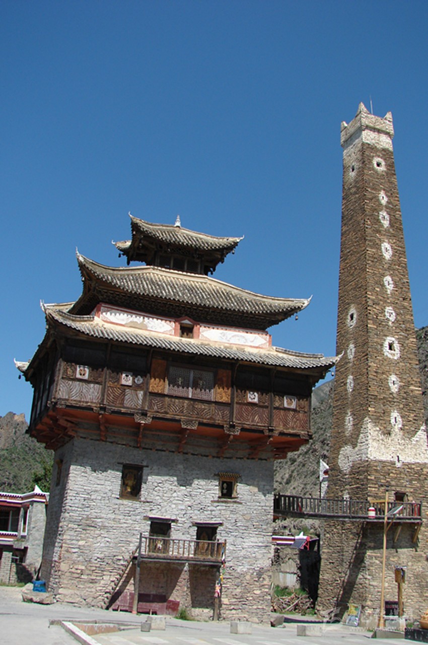過小金縣城,車行四十余里,轉(zhuǎn)過幾道山坳,遠(yuǎn)處,在藏寨的護(hù)衛(wèi)下,一座古碉拔地而起。朝陽的柔光輕輕地灑在古碉上,在藍(lán)色天幕的襯托下,顯得更加的偉岸雄奇了。沃日土司官寨,清乾隆十五年(1750)由沃日安撫司所建。“沃日”,藏語領(lǐng)地之意。走過一道橫跨沃日河的拱橋,便來到了土司官寨碉樓下的廣場。廣場占地約有二百余平米,前面有巍峨的護(hù)衛(wèi)碉和經(jīng)堂碉,后面和左面是鱗次櫛比的藏族民居。這里的藏族民居一般為四層,房屋外墻全用石頭泥土砌筑而成,所有的窗戶邊,用白色的石灰水勾勒圖案,外墻的底部及墻角處用石灰水勾勒出形如高山峻嶺的尖角。民居的大門前都砌有花臺(tái),里面花朵正競相開放。