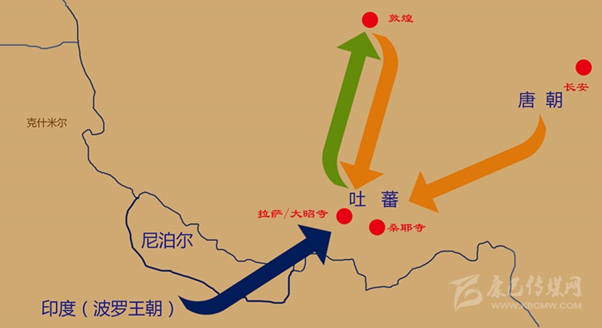 吐蕃贊普朗達(dá)瑪遇刺,藏傳佛教在吐蕃復(fù)興,歷史學(xué)家稱之為“后弘期”。后弘期有“上路弘法”和“下路弘法”兩次佛教傳入西藏的運動。在“上路弘法”的過程中,犍陀羅藝術(shù)被帶到了拉達(dá)克、古格,也帶進了衛(wèi)藏地區(qū)。而“下路弘法”則把漢地的繪畫風(fēng)格再次帶到了衛(wèi)藏地區(qū)的扎塘寺等地。