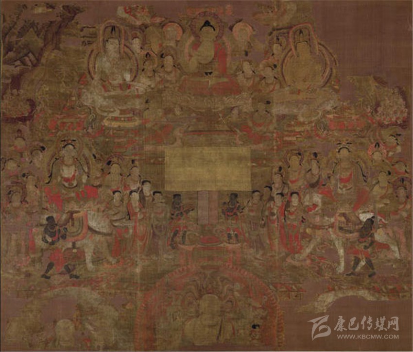 公元十三世紀(jì),印度波羅王朝覆滅。佛教中心超戒寺被毀,大量的佛教藝術(shù)家和工匠逃到了尼泊爾馬拉王朝,所以尼泊爾的藝術(shù)是從這個(gè)時(shí)期開始發(fā)展強(qiáng)大的,這相當(dāng)于是“藝術(shù)的接棒”。尼泊爾的繪畫風(fēng)格,就沒(méi)有石窟的概念了,透視立體也逐步被消解,然后用卷草等紋樣填滿背景,畫面變得平面化、精致化了。