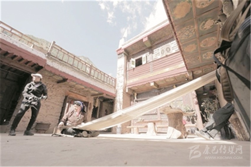藍(lán)藍(lán)的天空下,成群的牦牛散落在草場上吃草。在一派祥和的氣氛中,傳來一陣清亮的歌聲。拉姆的媽媽和哥哥扎西,正在腌制著香豬腿。