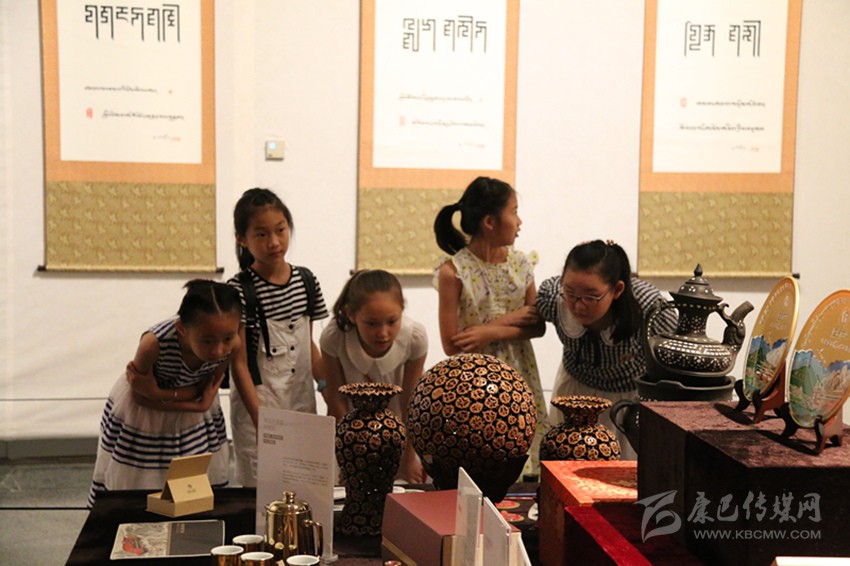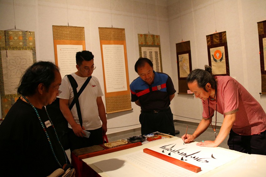 這幾天,一個十歲的外省小女孩觸動了呷多的心靈?!八谖颐媲皝韥砘鼗睾芫茫乙詾樗皇呛闷婵纯?,結(jié)果卻讓我驚訝萬分。”讓呷多想不到地是,小女孩竟然是個“藏文書法迷”,她曾到過西藏旅游,那里的美景讓她難忘不已,那里與藏文化有關(guān)的一切更讓她迷戀眷念。如今,在展館內(nèi)看到呷多寫書法,小女孩就被“定住”了。