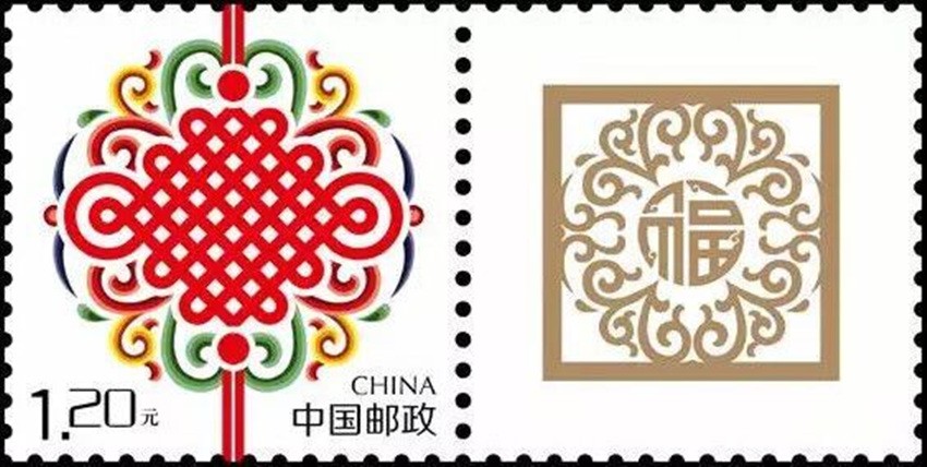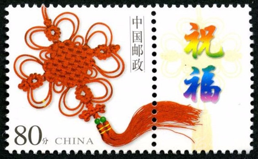 2002年5月10日,中國(guó)郵政發(fā)行《如意》個(gè)性化服務(wù)專(zhuān)用郵票一枚。主票圖案為如意柄端系著一個(gè)紅色“中國(guó)結(jié)”,附票有“祝?!倍?; 2003年3月3日,中國(guó)郵政發(fā)行《同心結(jié)》個(gè)性化服務(wù)專(zhuān)用郵票一枚。主票圖案為盤(pán)長(zhǎng)結(jié)4邊編織有心型繩結(jié)的同心結(jié),附票為“祝?!倍?;2006年9月25日,中國(guó)郵政發(fā)行《中華全國(guó)歸國(guó)華僑聯(lián)合會(huì)成立五十周年》紀(jì)念郵票一枚。圖案為阿拉伯?dāng)?shù)字“5”與中華全國(guó)歸國(guó)華僑聯(lián)合會(huì)圓形會(huì)徽組成數(shù)字“50”,象征全國(guó)僑聯(lián)五十周年,背景畫(huà)面為淡淡的粉紅色“中國(guó)結(jié)”。寓意歸國(guó)華僑與全國(guó)人民血肉相連,同心同德共同建設(shè)美好家園;2013年8月8日,中國(guó)郵政發(fā)行一枚《美好祝?!焚R卡專(zhuān)用郵票,圖案為象征喜慶的紅色“中國(guó)結(jié)”;2014年9月20日,中國(guó)郵政發(fā)行《中國(guó)夢(mèng)(二)——民族振興》特種郵票,其中第四枚“民族團(tuán)結(jié)”,圖案中載歌載舞的各民族群眾上方有一個(gè)大紅的“中國(guó)結(jié)”,象征著各民族大團(tuán)結(jié)。