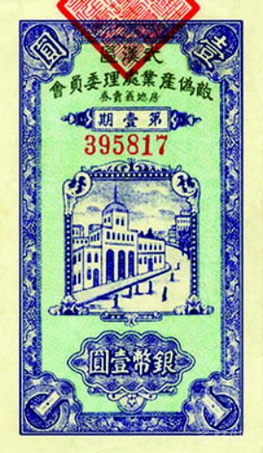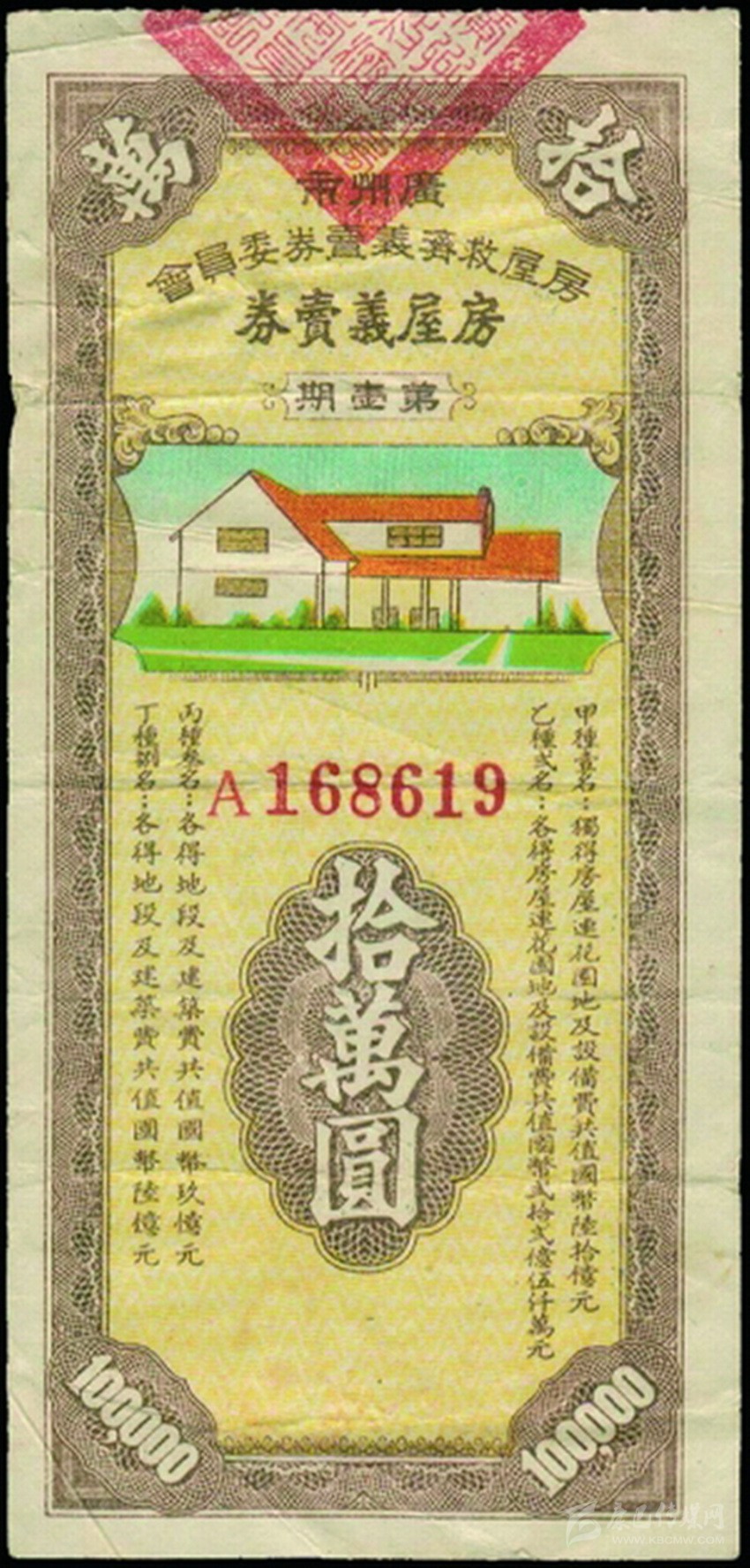 1949年3月,武漢市政府發(fā)行了100萬(wàn)張彩票,面值都是“銀幣一元”,可以買一張,中獎(jiǎng)率是兩萬(wàn)五千分之一,獎(jiǎng)品是位于漢口的別墅。推出彩票“房地義賣券”,以武漢區(qū)敵偽產(chǎn)業(yè)處理委員會(huì)名義發(fā)行,票幅高62毫米,闊106毫米,售價(jià)為銀幣壹元,計(jì)劃發(fā)行100萬(wàn)枚,計(jì)有39幢房屋充作獎(jiǎng)品,定于5月10日在漢口當(dāng)眾搖彩。1949年,正是國(guó)民黨政權(quán)風(fēng)雨飄搖之時(shí),因此5月10日的搖彩日也就成了彩票發(fā)行組織者的逃命日,六天后武漢解放,那“房地獎(jiǎng)”未能兌現(xiàn)。