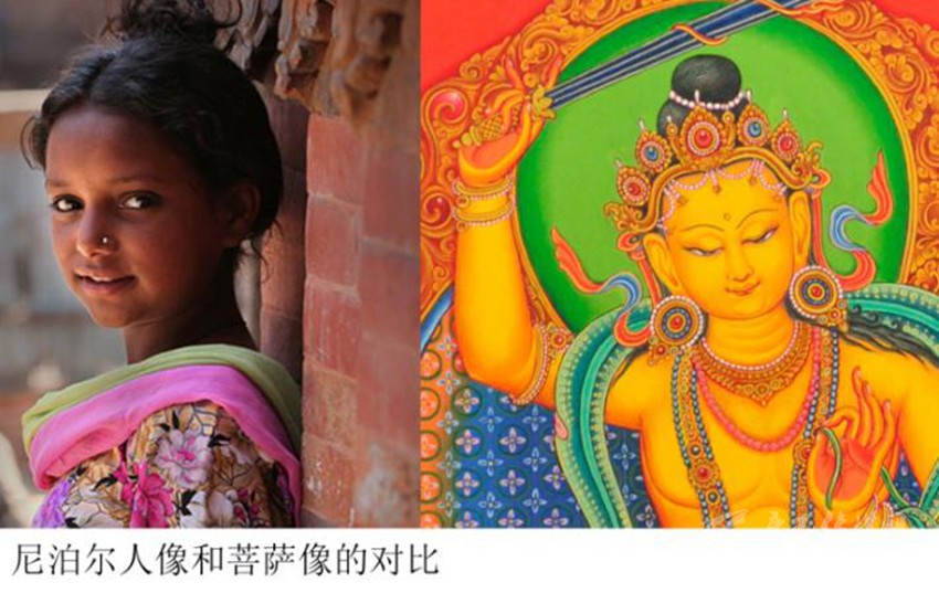 特別值得注意的是:之前佛教藝術(shù)的帕拉風(fēng)格繪畫中的臉型普遍是方正偏長(zhǎng)的,而在尼瓦爾唐卡里,臉型普遍是方正偏短。偏短的方臉會(huì)讓五官顯得更加集中一點(diǎn),特別是眉額比較大、眼睛位置下移,這樣的感覺(jué)有點(diǎn)近似于嬰兒的面部比例。而眉骨、鼻骨高挺,又不似兒童,這樣的面部特征其實(shí)和尼國(guó)人的長(zhǎng)相比較接近。也許是尼瓦爾人善于觀察、擅長(zhǎng)描摹的天分,逐漸把本民族沉靜的性格與容貌,潛移默化地滲透進(jìn)了唐卡,產(chǎn)生了新的風(fēng)貌。