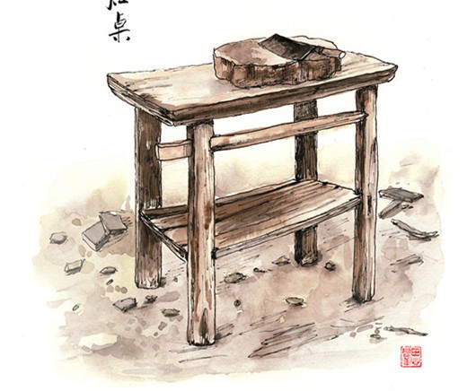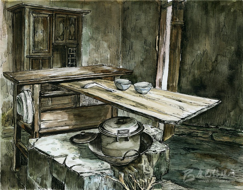在我們家,灶屋里砌著一個(gè)四方形兩灶孔的大正灶,兩條寬板長(zhǎng)凳靠墻擺放,交于墻角,像木匠的大曲尺,半圍著象征一家之主的正灶,其中一條正對(duì)著灶門口。灶與凳之間的通道,僅容曲膝而坐。灶上常年擱著烏黑的鼎灌和鐵鍋,灶的背面則立著一張長(zhǎng)條狀的灶桌。灶桌是洗碗和切菜的地方,在其橫長(zhǎng)的縫隙里插上接手板,懸空于灶面之上,擺上碗筷,又起到了飯桌的功能。灶屋進(jìn)門的另一面墻,靠墻而立的,是高高的碗欃和一個(gè)瓦水缸。碗欃是平素放碗放剩菜的地方,本是漆了老紅色,卻因西墻的木格窗小,光線幽暗,與四壁及樓板的烏黑融為了一體。水缸上口有一塊擱板,板上放兩只寬口瓦缽,缽里各放著一只竹筒水勺,一大一小。每天早晚,家人擔(dān)了木桶,挑來(lái)井水倒入水缸,此處的地面,長(zhǎng)年潮濕。灶屋是我們一日三餐吃飯喝茶休息閑談的場(chǎng)所,煙火歲月,多是在此度過。我開蒙上小學(xué)后,每到夜晚,吃過飯后,將煤油燈盞移到寬板長(zhǎng)凳,雙膝跪地,伏在凳灶之間的空隙里寫作業(yè),有時(shí)一不小心,額前頭發(fā)就被燈盞的火焰燒得焦臭。我自小愛學(xué)習(xí),成績(jī)很好,每學(xué)期都有獎(jiǎng)狀,老師夜里來(lái)村間家訪時(shí),也常來(lái)我家坐,是我父母最大的榮光。