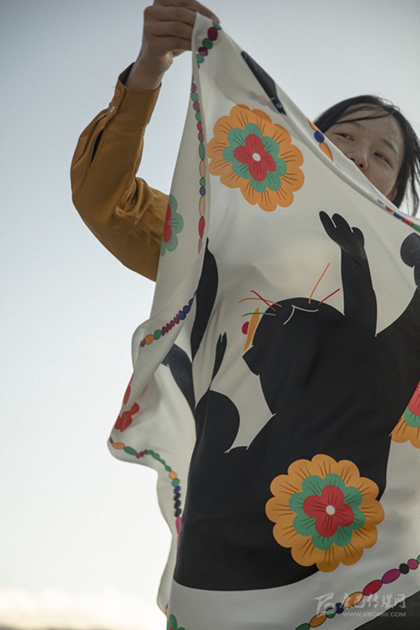 從醞釀、構思、調研到創(chuàng)作、修改、打版,整整半年時間,殷九龍同設計團隊深入藏鄉(xiāng)田園鄉(xiāng)城的村村寨寨,數(shù)十次敲開農(nóng)牧民群眾的白藏房,遍訪家家戶戶的廚房灶臺,搜羅鄉(xiāng)城與貓的不解之緣,收集當?shù)亍柏垺钡母黝愋蜗?,同時積累所到之處建筑家具、生產(chǎn)資料、生活物資的材質、圖案及用色。