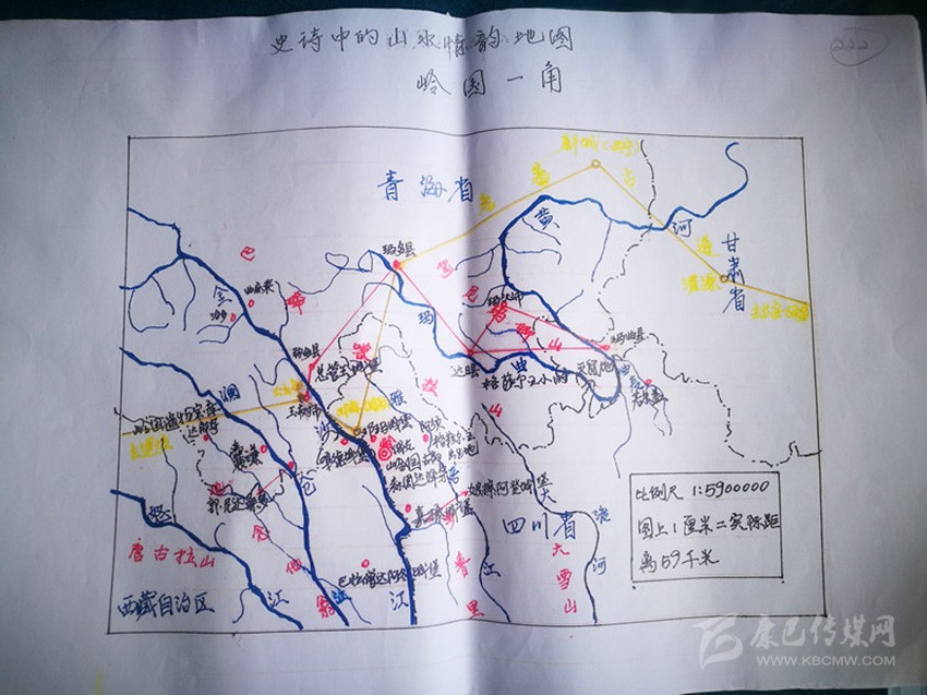幾十個(gè)春秋里,劉安全所做的遠(yuǎn)不止這些。他還自制了平面地圖、格薩爾王族譜圖等。根據(jù)實(shí)地考察所見,他繪制了43個(gè)“嶺”國城堡遺址地形簡圖,記者見到了其中幾幅。圖中,大山、河湖、遺址等清晰可見,不失為了解格薩爾史詩的上好資料。