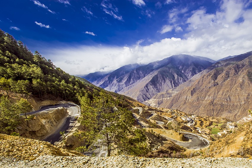 從得榮縣城出發(fā),途經(jīng)日龍鄉(xiāng),汽車順著盤山公路開始往下行駛,到半山腰處,司機(jī)輕輕踩一腳剎車熄火,在此作短暫休息。這時(shí),我打開車門俯瞰金沙江畔的因都?jí)?,但見公路兩?cè)一排排整齊的房屋像火柴盒一樣連綴在平坦壩子上,房屋下端,麥田梯次舒展,麥浪涌動(dòng),蔚為壯觀。