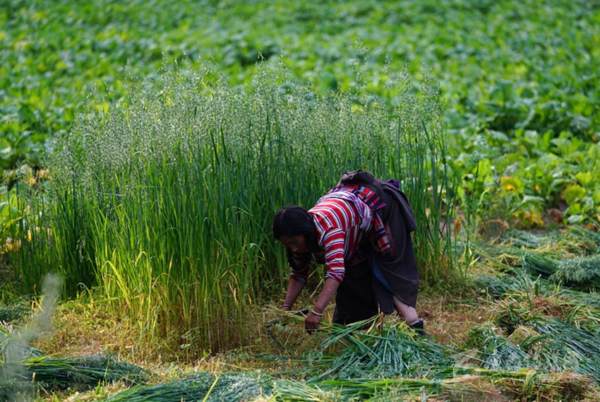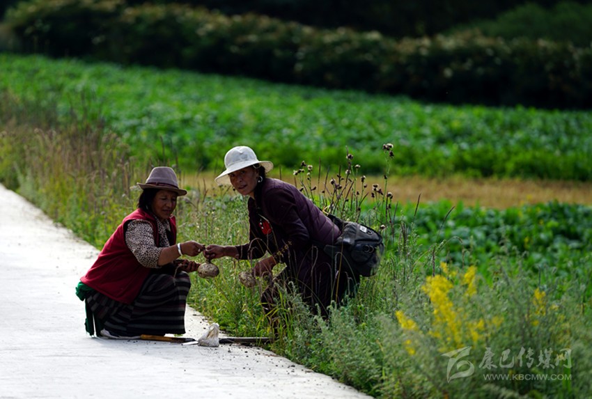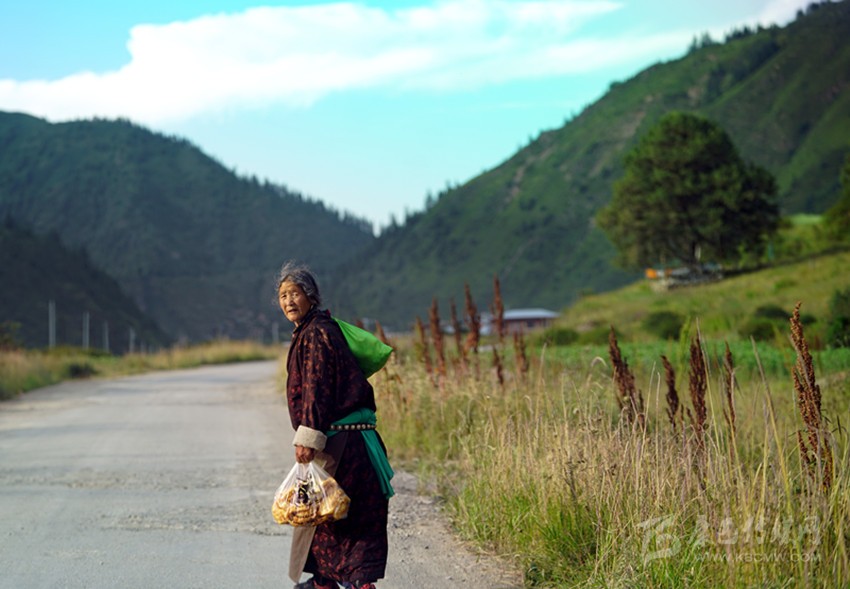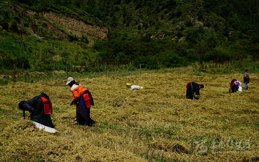 開始收割了,從坡地到川地,到處是收割機(jī)的聲音。青稞是車巴溝的主要作物,因?yàn)橐デ囡妫贼佤?。村里人忙得團(tuán)團(tuán)轉(zhuǎn),收割機(jī)開過去,大家就跟在后面撿穗子。如此往復(fù),一直要到糧食拉到家里。