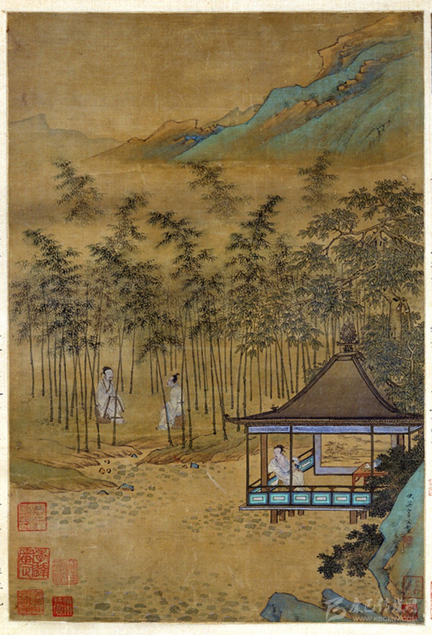此圖意境極像唐代詩人王維的藍(lán)田山別墅。這里林木茂密,山澗淙淙,館舍、房屋散布其間,每到夏季,山風(fēng)習(xí)習(xí),涼爽怡人,王維和文友們?cè)诖硕认谋苁睿贯烇嬀疲務(wù)撛娢?,修身養(yǎng)性,過著悠閑自在的隱居生活。他在《竹里館》一詩里寫過自己的隱居快樂感受:“獨(dú)坐幽篁里,彈琴復(fù)長嘯。深林人不知,明月來相照。”全詩格調(diào)幽靜閑遠(yuǎn),仿佛詩人的心境與自然的景致全部融為一體了。宋朝詩人楊萬里喜歡在皎潔的月光之下,清輝孤影,來到搖曳的竹林中,聽著夏夜里悅耳的蟲鳴,夜深氣清,盡管沒有涼風(fēng)送爽,但是悶熱暑氣頓時(shí)消失,于是他寫了一首《夏夜追涼》詩:“夜熱依然午熱同,開門小立月明中。竹深樹密蟲鳴處,時(shí)有微涼不是風(fēng)。”